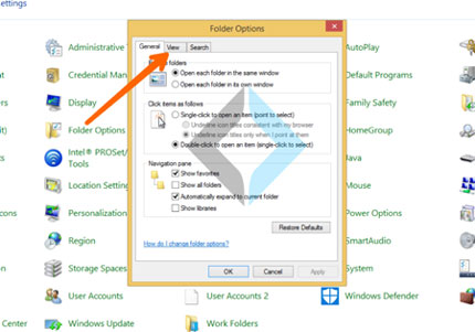 STEP-:3 Folder option me enter hone ke baad aapko yaha par 3 tab dikhte hai jo kuch is tarah se hote hai General, View aur Search to aapko second tab yani ki view par click karna hai.